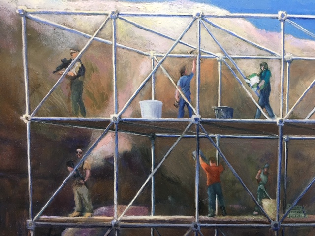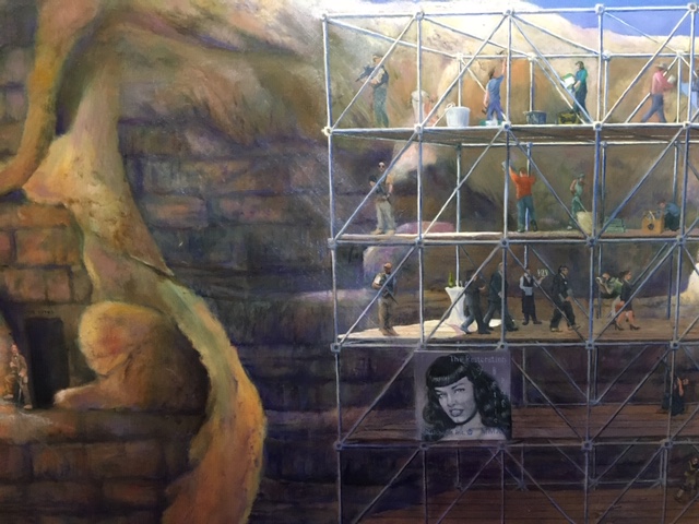 Another day in the office. The plasterers on the scaffolding are working hard to restore Bettie Page in her full glory.